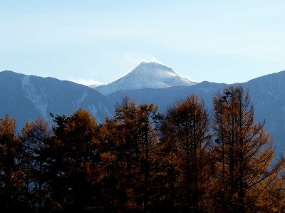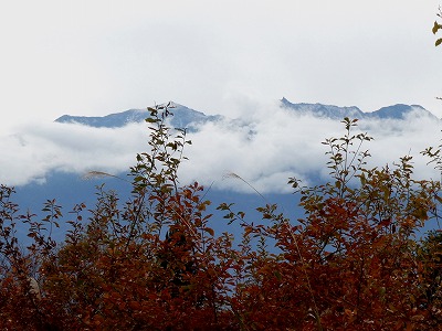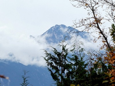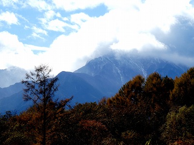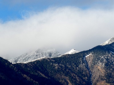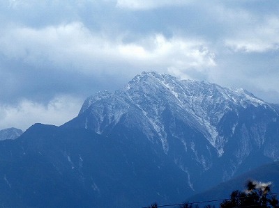 甲斐駒ケ岳の山頂は雲に隠れていましたが、谷筋が白く見え、甲府気象台も甲斐駒の初冠雪を発表しました。