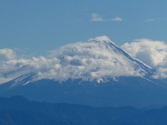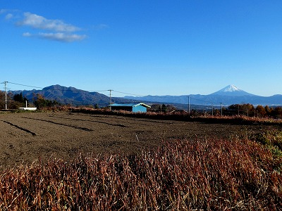 今日の富士山は中腹より上は雲が掛っていましたが、風があり、雲が動いていましたので、畑をゆっくり一回りしたところ、西側の稜線が見え、冠雪した様子がわかりました。