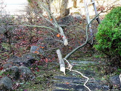 道路側のカエデが落葉して、落ち葉の片付けと、かなり太い枝を強剪定しました。