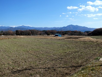 風が強い畑から見えた金峰山から茅ヶ岳まで、青空の下、きれいな稜線が見えました。