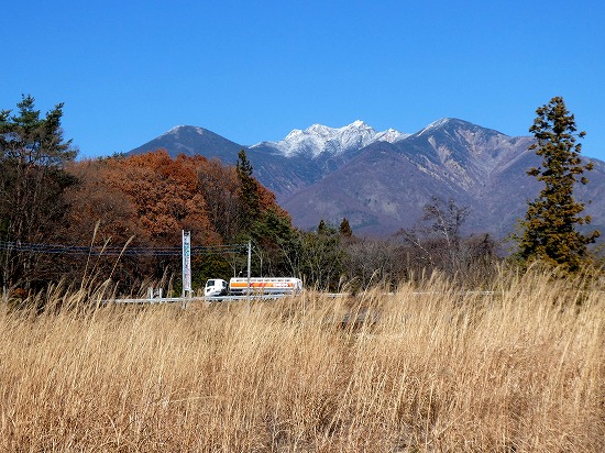 身曾岐神社下の中央道のガードをくぐり、八ヶ岳と中央道を走るトラックが写っています。