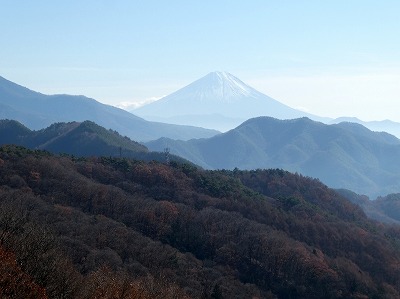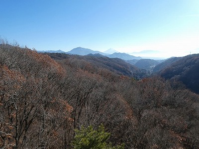 川俣川渓谷を覗くと、国道141号(通称清里ライン)が見えました。山脈の彼方に富士山が見えましたが、光の角度でイマイチの写真です。