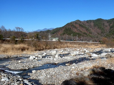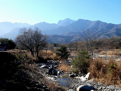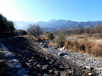 清流が流れる大武川、近くの山の肩に八ヶ岳が見えます。