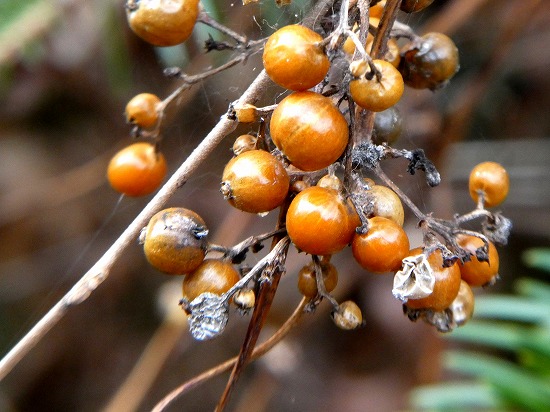 「イチイ」の葉に5~6ミリほどの黄褐色の実がついていました。「イチイ」の実は赤で?、他の植物を調べてみましたら、「ヘクソカズラ」が、「イチイ」の葉につるを絡ませ、花が咲き、黄褐色の実が生っていました。