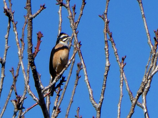 茶色を主体とする野鳥で、顔が黒白模様、ホオジロのオスのようです。
