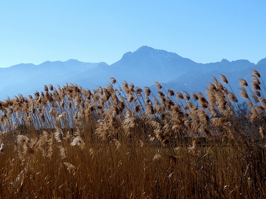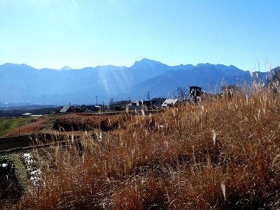 甲斐駒が見える川沿いにススキに似た草丈が高い銀白色の穂がなびいていました。