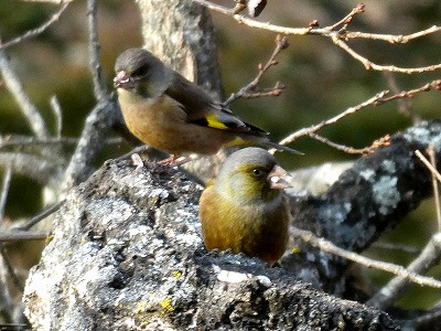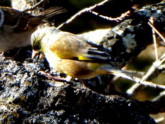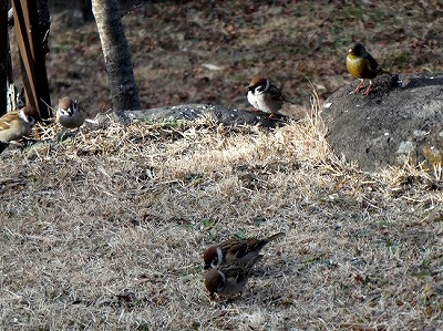 カワラヒワとスズメです。他の野鳥が来て欲しいのですが、なかなか近寄れません。