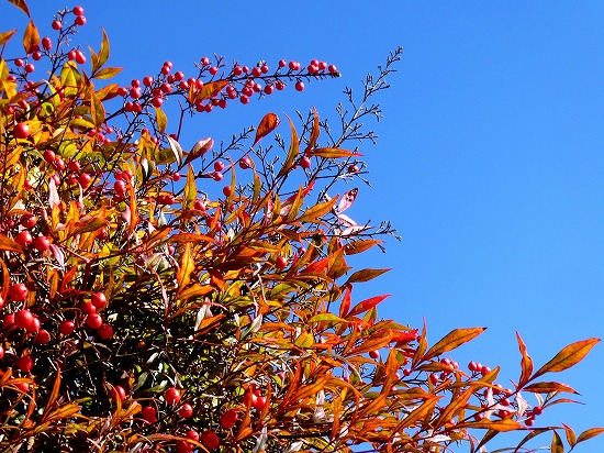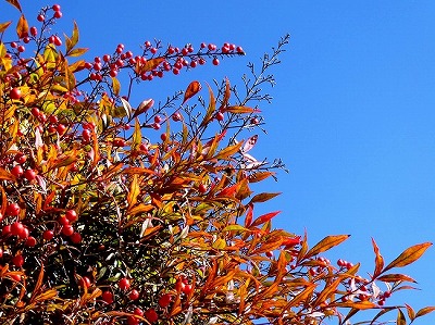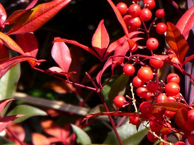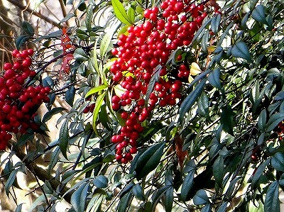 別荘沿いの道を歩いていると、赤い実がブドウのようにぶら下がっていました。葉は緑色で赤い実が生る「ナンテン」でした。