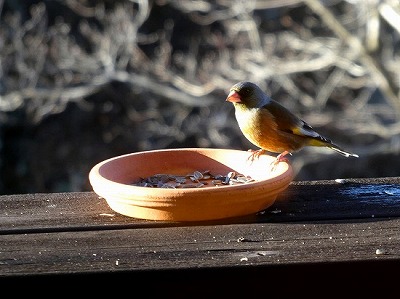 餌場に来る野鳥はピンクのクチバシのカワラヒワで餌場から離れません。