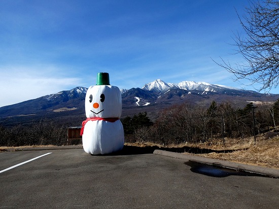 平沢峠駐車場に着くと、駐車場の端に大きな雪だるまのキャラクターが鎮座していました。