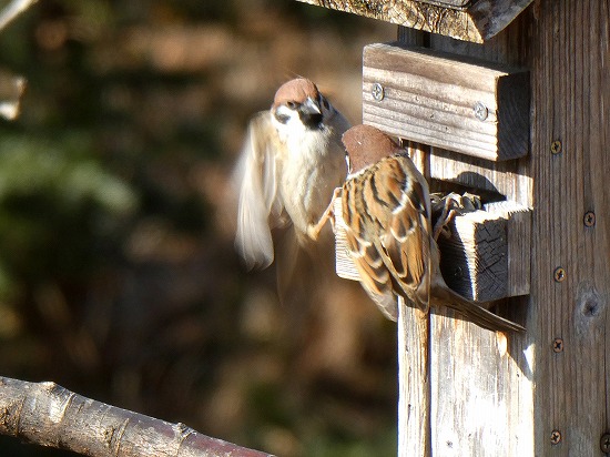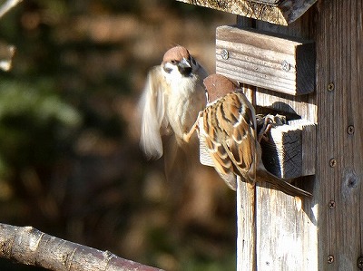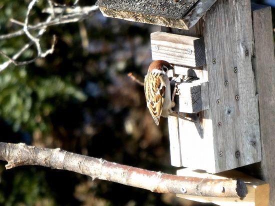 最近スズメがよく現われるようになり、エサ箱で場所の取り合いをしています。