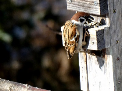 スズメがエサ箱に来ると、エサの出口にしがみついて離れず、ヒマワリの種を食い散らかしています。