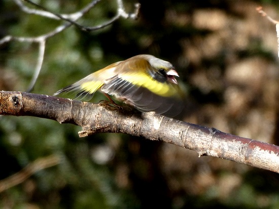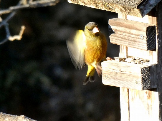 毎日やって来る「カワラヒワ」、派手な小鳥ではありませんが、翼を広げると、黄色い羽が目立ちます。