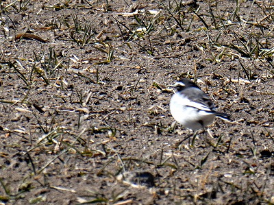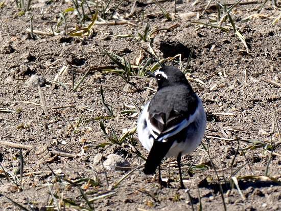 晴れ渡った畑を散歩していると、尾をふりふり白黒の野鳥が歩いていました。