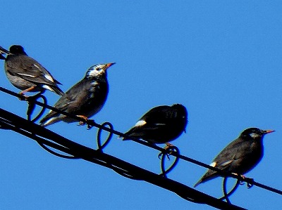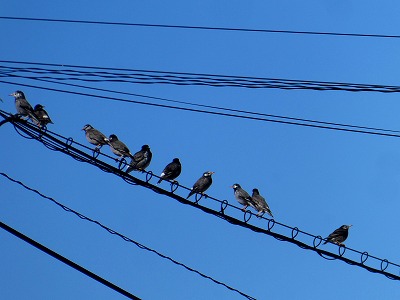 カメラを持って散歩していると、電線に一列にとまる野鳥に出会いました。スズメかと思い撮って見ると「ムクドリ」でした。