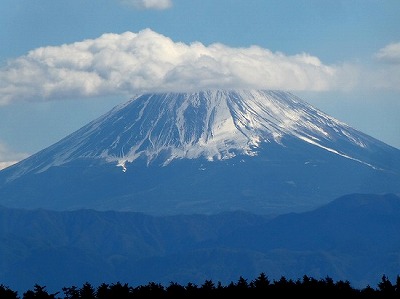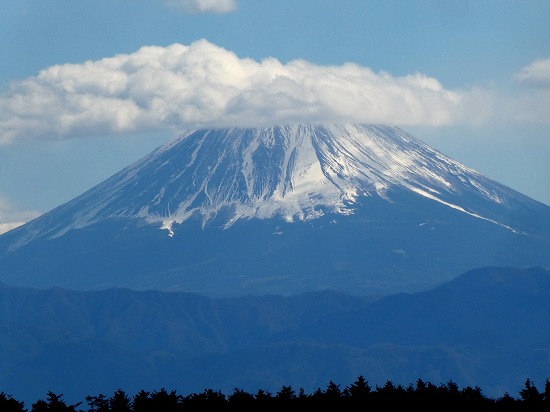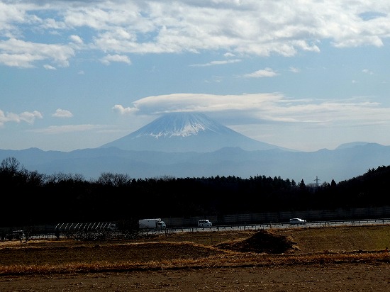 霞んで見えた富士山ですが、白い帽子を被った笠雲が発生していました。