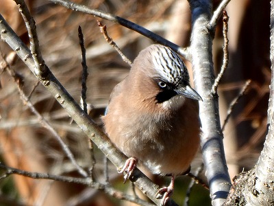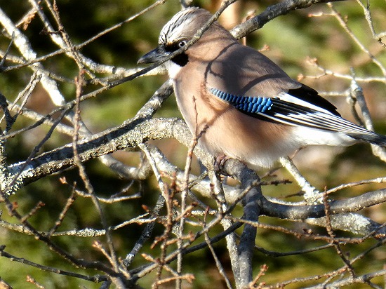 時々姿を見せるカケス、茶系の大きな体長(33㎝)に、翼の一部が青白黒の細かい模様が目を引きます。