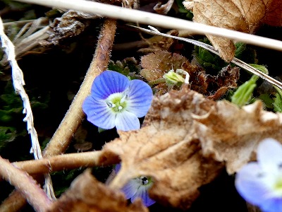 枯れ草の法面に、青いものが見えました。コンデジのレンズを目一杯近づけて撮っています。