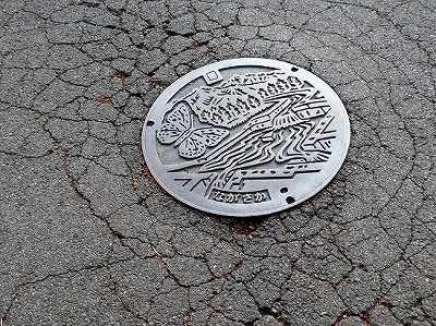 デザインは八ヶ岳をバックに、国蝶オオムラサキ、三分一湧水がデザインされています。(特定環境下水道小形枡蓋)