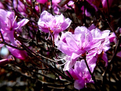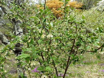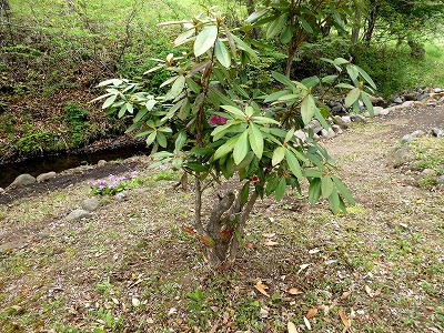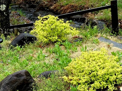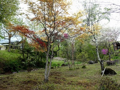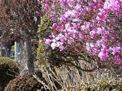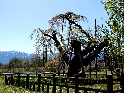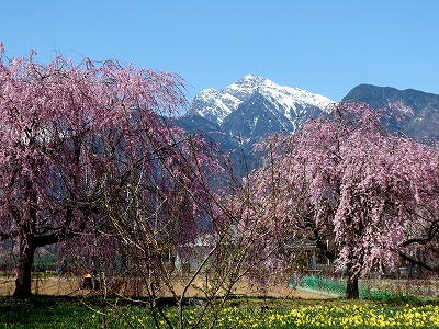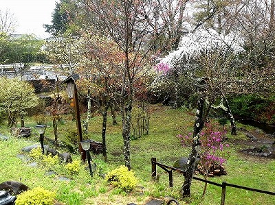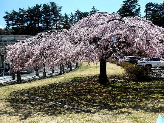 「道の駅こぶちさわ」の温泉施設の前に背丈が低い枝垂れ桜が数本植えられています。まだ開ききっていませんが、綺麗に咲いています。