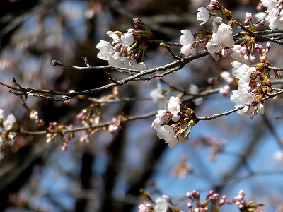 体験工房前の桜、「ソメイヨシノ」は満開のようですが、枝垂れ桜は蕾もあります。